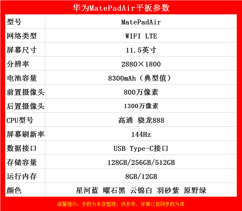 官方标配:平板(内置电池) x 1SuperCharge 充电器 x 1Type-C 数据线 x 1快速指南 x 1三包凭证 x 1