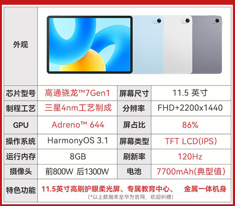 官方标配:平板(内置电池) x 1快速指南 x 1充电器 x 1Type-C 数据线 x 1三包凭证 x 1