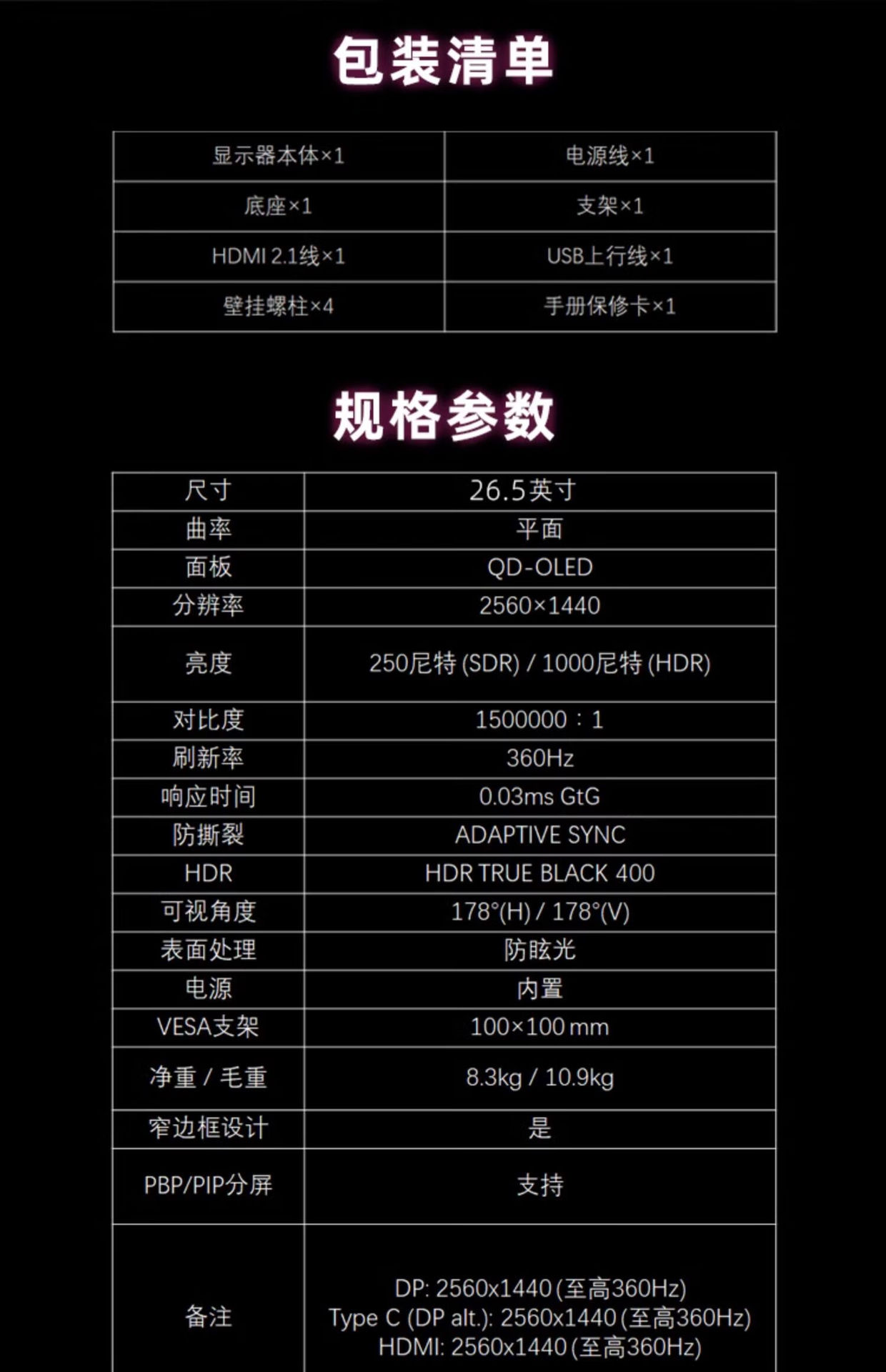 MPG271QRX QD OLED 27英寸360Hz QD-OLED(英寸)