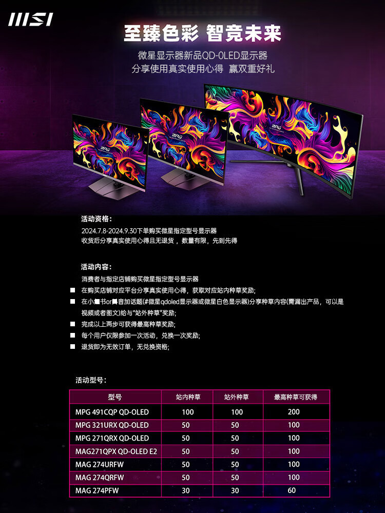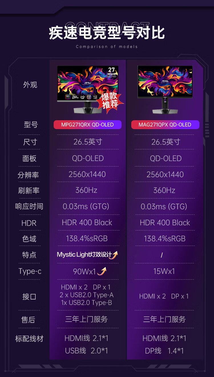 MPG271QRX QD OLED 26.5英寸2K 量子点 OLED 360Hz Type-C显示器 数量